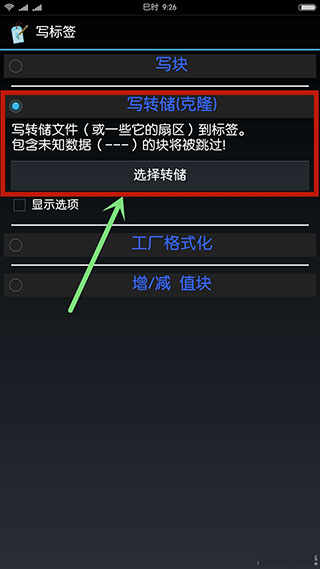 ⑨、勾选刚刚保存的标签,选择后点击软件最下方“选择转储”进行下一步操作(须注意的是,此时需将CUID空白卡至于手机NFC感应区);