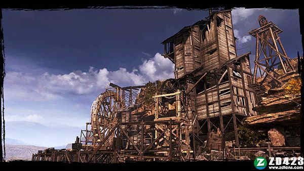前行遭遇伏击,射断吊钩上的绳子,坠落的圆木会砸死三名枪手。右转,几名匪徒沿着坡道冲下来,同样射断吊车的绳索,滚落的圆木将他们辗杀。往到一部转动的大水车,左转过木桥,有两名匪徒冲了过来,近战放倒。