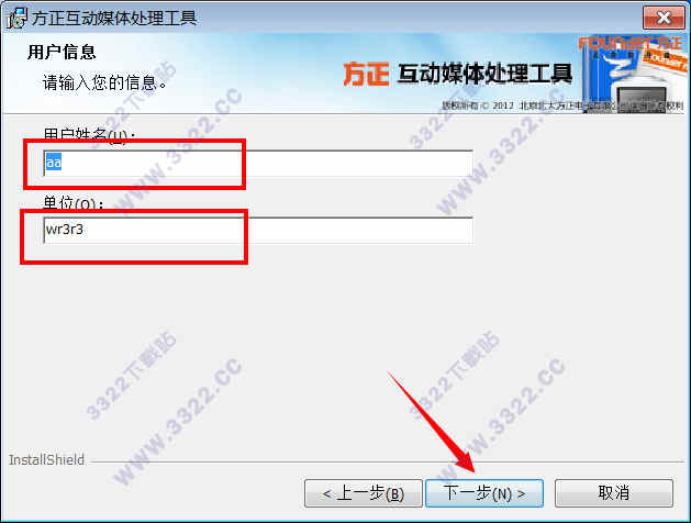 3、输入方正飞翔用户信息,用户姓名aa,单位wr3r3,点击下一步