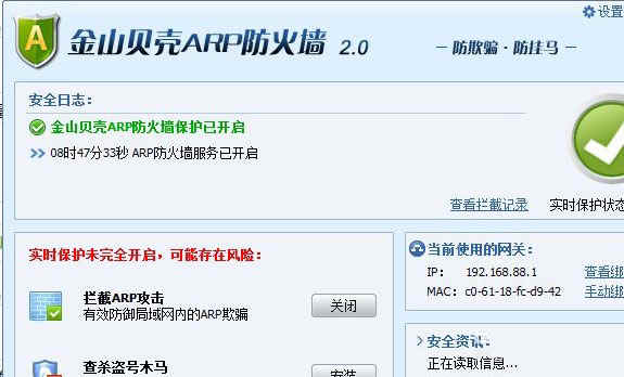 金山ARP防火墙是由金山软件早期出品的一款完全免费,功能强大的ARP防火墙软件。它能够双向拦截ARP欺骗攻击包,监测锁定攻击源,时刻保护局域网用户PC的正常上网数据流向,并且具备支持Vista、安装免重启、低资源占用等优势,是一款是适于个人用户的反ARP欺骗保护工具!目前,市场上大部分的AntiARP开始收费了,虽然可以免费使用,但前提条件是需要给它修改了我们的主页,这样又让很多人不爽。小编在亲自体验一番后,觉得它值得推荐给大家使用。一方面,金山ARP防火墙是金山公司推出的一款专门针对ARP攻击的防火墙软件,能够支持所有Windows操作系统,并且完全兼容其他杀毒软件和软件防火墙,完全无需担心软件冲突问题。而且软件使用内核级网络数据包过滤,效率更高,丝毫不影响上网、下载和玩游戏,还集成查杀盗号木马功能,保护计算机不受木马或者病毒的侵害。此外,改工具还可以识破伪造的网关地动态获取、并分析判断后为受保护PC绑定正确的网关地址,从而时刻保障保护本机上网数据的正确流向,操作简单,上手快捷,后文附有详细的图文教程,亲测可用,有喜欢的朋友不妨下载体验。