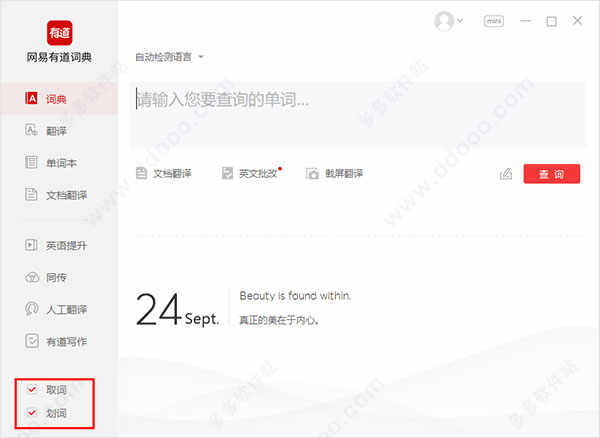 1、打开有道词典,在软件窗口的左下角勾选“取词”和“划词”;