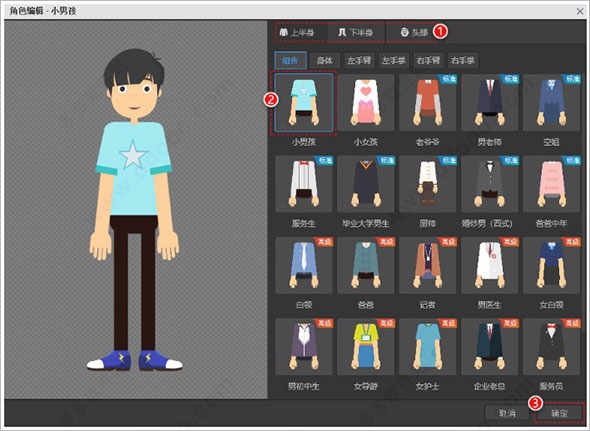 步骤:①选择一个分类 -- ②点击所选素材,即可应用到人物上 -- ③点击【确认】进入下一步