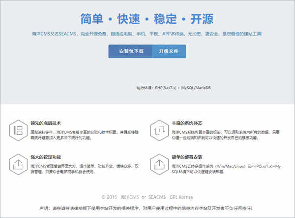 海洋CMS支持多操作系统(Win/Mac/Linux)在PHP(5.x/7.x)+MySQL环境下可以快速键安装部署。