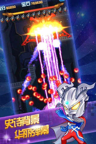 全民奥特曼飞机大战最新版本是一款运行在安卓平台上最火的手机射击游戏,除了正常的通关模式外,还拥有挑战模式,可以挑战3个难度的boss,加入了成就系统,玩家完成游戏中的成就就可以获得成就奖励,包括必杀道具、护盾道具还有大量的宝石。游戏完美还原了官方剧情,华丽弹幕,震撼音乐,让你体验M78星云独有魅力。游戏操作十分简单,和全民飞机大战相似,再加上超多经典的boss,数种萌翻的小怪兽,带给玩家非凡的游戏新体验。在全民奥特曼飞机大战游戏中,玩家们可以化身为梦比优斯、赛罗、贝利亚、银河等等奥特曼,每个奥特曼的技能各有不同,玩法也不同,玩家们都可以逐一体验,感兴趣的话不妨来下载体验吧。
