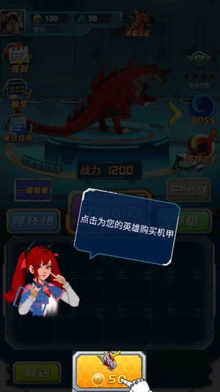 2、之后跟着教程走,点击合成区域,选择购买你的机甲英雄;