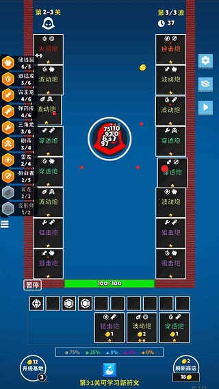 游戏中每个炮塔都有各自的羁绊,组成不同的羁绊可以产生各种效果。掉落的宝石以及装备可以提升炮塔的各种能力,升级基地可以解锁新种类炮塔以及提升高星炮塔刷新概率。