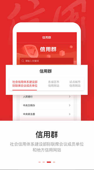 信用中国安卓版是由国家公共信用信息中心主办的一款信用服务平台,该软件信息权威,具有很多实用的功能内容,能够为用户提供信息查询、信用修复和异议申诉等便捷服务。打开软件首页便向用户展示了各种专题专栏,在这里,用户可以查看政策法规、信息公示、行政管理等内容,用户还可以在这里查看到各种关于信用方面的动态;在服务中,用户可以在这里进行各种业务办理、授权管理;在信用群中,用户可以在这里查看到各个公共机构的官网,软件功能完善,实在是每个人都需要的一款必备软件,需要用到这款软件就快来下载吧!