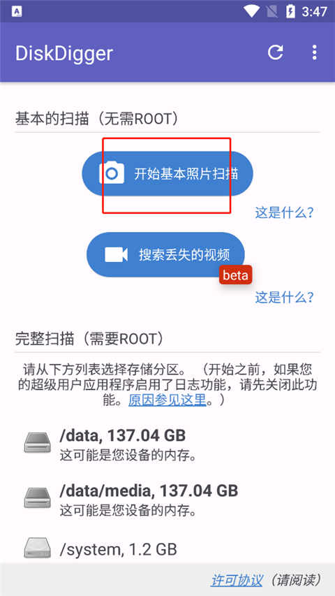 1、进入磁盘挖掘机diskdigger首页,点击开始基本照片扫描;