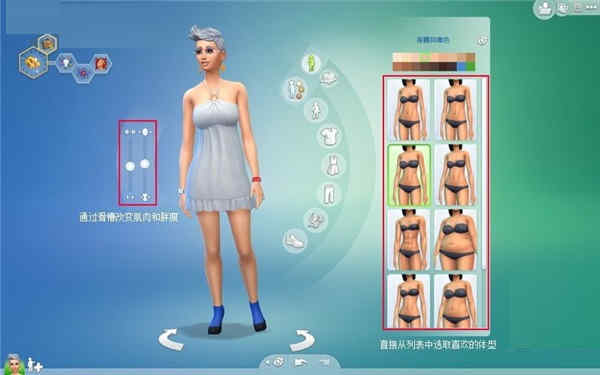 如果不想用滑槽来调节,单击角色的身体,选择身体图标,能看到很多预设的身形和肤色,常见和罕见的身形都可以简单地挑选使用