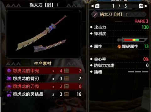 这两把太刀完全就可以用到怨虎龙,打到怨虎龙这个怪物的话,可以做祸太刀,攻击力130算是非常高了,外加上还有爆破属性,如果在一个地方积累了爆破属性的话,最后会爆破,一下估计有100的血,很可观了。