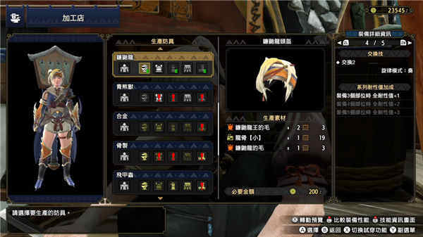 本作移除了装备三件套的特殊效果,改为了耐性加成,所以不需要强行追求套装效果了。因此在防具的选择上随意了一些,游戏前期由于装备上基本也没什么好技能,所以推荐选择带有看破,攻击等泛用性高的输出向技能,如镰鼬龙王的装备。如果不是为了采集则不要选择有地质学,植生学等对战斗没有帮助的技能。