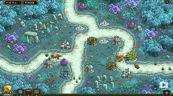 第三波下方路口开始出怪,小蜘蛛来袭,不过按照下图的防御部署,加上剧毒蔓藤的帮助我们可以轻松防御住。右边出现的重甲兵法师塔足以对付。