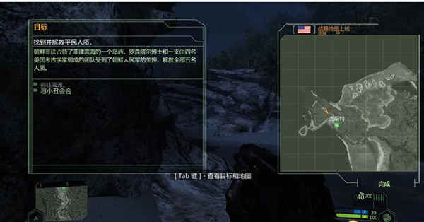 按住TAB键查看大地图和任务目标。绿色为主目标,黄色为支线任务。