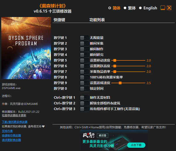戴森球计划十三项修改器是由大神风灵月影针对于国产模拟经营游戏“戴森球计划(Dyson Sphere Program)”原创制作的一款多功能修改器,它能够为戴森球计划的玩家提供无限能量、瞬间采集、瞬间研究和瞬间制作等无敌功能,还能够让玩家在游戏中制作无需材料,你想要解锁所有的组件和建造也是没有问题的,除此之外,你还能够通过戴森球计划修改器来设置游戏的速度和各种移动速度和跳跃高度,大大的降低了游戏的难度,让新手玩家轻轻松松就能够上手游戏,增加游戏乐趣,喜欢戴森球计划这款游戏的朋友可以下载修改器使用哦!