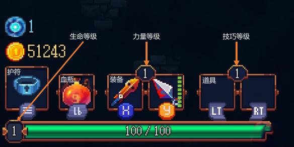 生命将提高生命上限,力量将提升武器的伤害,技巧将提升道具的伤害并降低冷却时间。