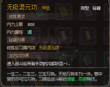 非常厉害的道玄宗镇派内功,橙色武学是4回合CD,紫色武学是3回合CD,有了这本内功之后加了新出产的忘忧丹,实现3个橙色武学轮流放不间断了。其它6个格子全部堆内功堆属性就行了。