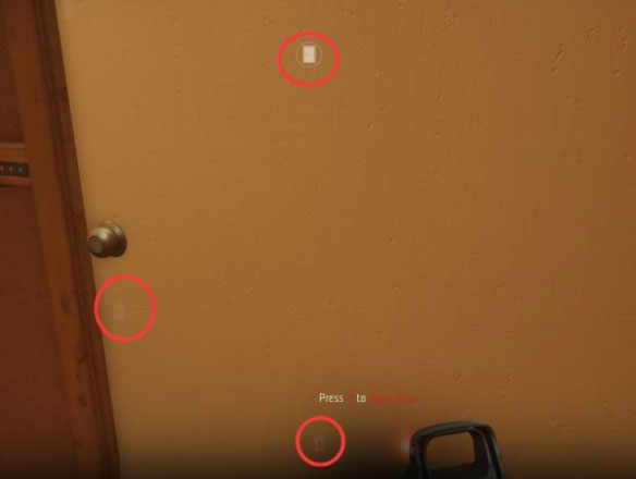 6、门有最基本的3种开门方式,靠近门把手是peek door,你会经常用到它,可以使用战术投掷物,检查陷阱等,视角往中间一点是open door,视角在门的下半部分是踹门(你们的最爱),注意,上锁的门一下踹不开,但是可以把门踹解锁,后续可以继续踹开门或者正常开门。当门后有歹徒且门是锁上的情况下踹门,这种举动和自杀没区别。