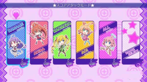 得分进攻模式以Ecstasy shot的连击、速度加分和fever状态等为目标,基于各自的标准争取高分的模式。如果是故事模式通关了一次的路线就可以自由选择关卡,也可以只玩喜欢的女主出场的关卡。