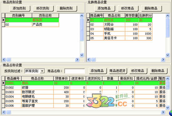 商品设置:主要设置商品所属的类别、商品编号、商品名称、预设单价、进货单价、商品数量、打折比率。