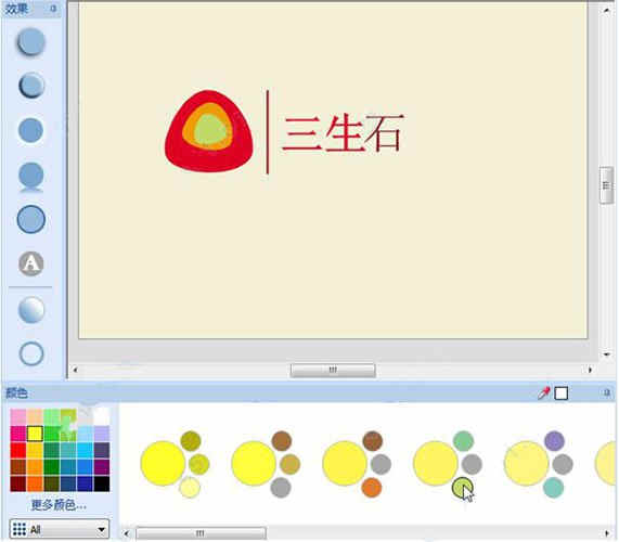 3、logo设计怎样布局才美观,更有个性呢?我们这个时候就需要对左边图形进行一下修改了。我们可以看出,这个图形是有三部分组成的,我现在只想把最中间的那个圆三角的颜色修改一下。方法:用鼠标点击选中这个图形,然后在下面的颜色库中选择喜欢的颜色。