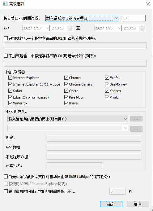 6、在配置设置方面,您可以按日期和时间过滤结果,选择检索信息的Web浏览器,仅为当前用户或所有用户加载浏览历史记录,以及使工具生成通过指定存储历史项的位置来获取信息