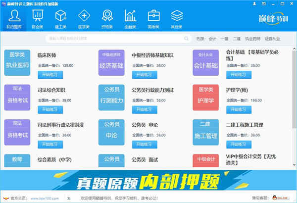 巅峰特训云题库绿色版是一款题库资源丰富、专业的刷题软件,软件包含众多行业考试题库,用户能够在线刷题,题库内容全面权威,同时具备无需安装、易携带等优势,用户双击一下就能在线刷题。考证的用户每年都在增加,丰富的考题资源很难找到,不仅找不到全面的考题,有的题库资源已经非常老了,今天小编特意为大家找到巅峰特训云题库绿色破解版,不仅题库资源非常丰富,还拥有历年的考试真题,无需激活码就能直接点击购买。软件无需安装下载后解压即可使用,解压后找到购买题库资源,双击运行就能进入程序界面了,界面清爽一目了然,疯狂刷题还能模拟考试,进步肯定是有的,还能提高你的成绩。还有错题分析整理、错题收藏、专门练习,也能在线模拟考试,为用户提供丰富的职业考试题库资源,如建工类、财会类、医学类、资格类、金融类、国考类和其他类七大模块题库,选择自己需要的题目资源,就能开始练习,提高你的拿证几率。大量的错题也有解析,不用担心一直刷题没有成绩没有提升,高效刷题,轻松通过获得你的证书,有需要的朋友欢迎下载体验。