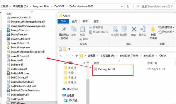 1、首先在本站下载解压,得到中望CAD建筑版2021源程序与破解补丁;