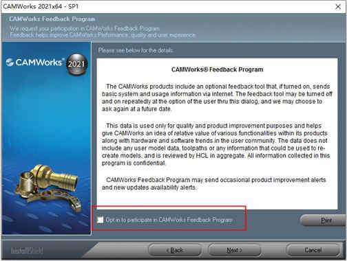 3、取消勾选参加CAMWorks反馈计划,依提示进行下一步;
