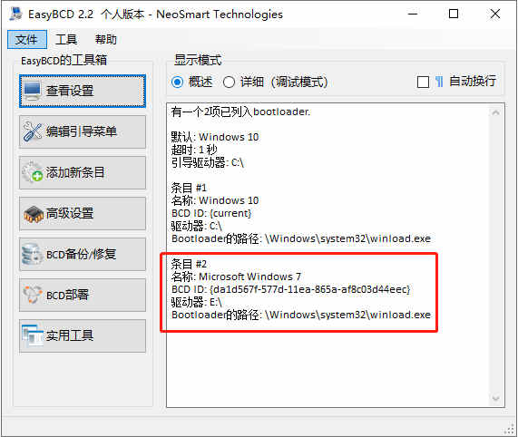 4、点击“查看设置”,看看有没有发生变化,如下图,条目#2下名称是Microsoft Windows 7,说明系统引导选择项添加成功;