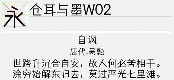 仓耳与墨w02字体免费电脑字体是一款赏心悦目、百看不厌的中文字体,字体将篆刻的“刀意”融入其中,在笔形处理时模拟了类似篆刻的刀刻痕迹,同时为中和这种“尖锐”,在转折和“口”字结构上使用圆转角的处理方法,让整个字内方外圆。风格偏向现代创意字体,强调厚重与力量,具有醒目、有力和前卫的特点。可以很好的应用于文本装潢、信息展示、网页设计、篆刻制模、数据制作、装潢设计、计算艺术设计、视觉设计、字帖等一切合法应用场景,有喜欢的朋友可免费下载收藏。