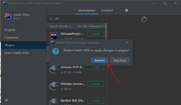 7、下载完成后点击“restart ide”——“restart”;