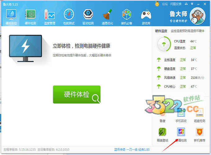2、鲁大师能定时扫描您的计算机的安全情况,为您提供安全报告,有相关的资料的悬浮窗,可以显示“CPU温度”、“风扇转速”、“硬盘温度”、“主板温度、“显卡温度”等。会到微软官方网站为您下载安装最适合您的机器的漏洞补丁。“鲁大师”只会安装您的机器需要升级的漏洞补丁,并支持下载同时安装,大幅提高补丁安装速度,节省热门软件推荐安装您的等待时间。