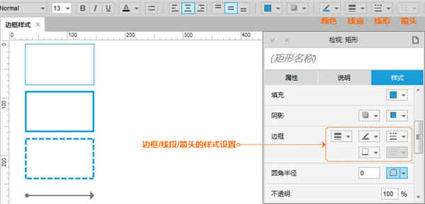线段、箭头和元件边框的样式可以在快捷功能或者元件样式中进行设置。