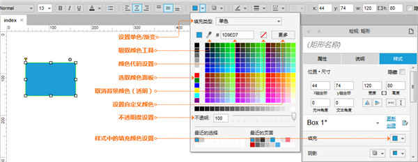 选择要改变颜色的元件,点击快捷功能区中的背景颜色设置按钮,选取相应的颜色,或者在元件样式中进行设置。