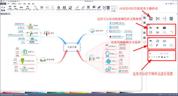 9、接下来继续美化,让它更加棒。找到右侧菜单栏上第一个像刷子一样的工具,点一下,会出现一些编辑选项,你可以在这里修改主题样式、背景、线条粗细、框架外形等等,尽情发挥你的想象自由创作吧。