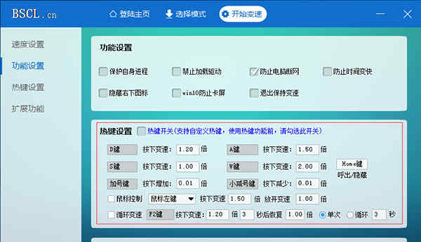 4、热键设置变速齿轮热键设置分为按键控制变速、鼠标控制变速、循环变速、呼出隐藏。灵活运用里面的功能,可以帮助你更有效的变速。