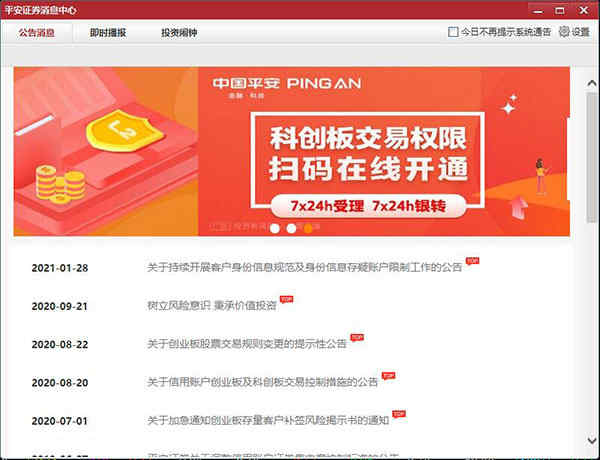 1、安装完成后,会自动进入平安证券慧赢软件的主界面,并弹出平安证券消息中心。平安证券消息中心分为三大块,分别是公告消息、即时播报和投资闹钟。