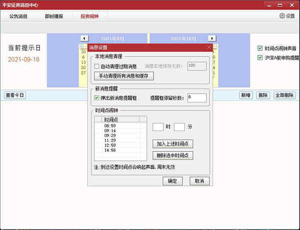 5、点开投资闹钟页面右上角的设置还可以进行本地消息的清理,以及增删时间点的功能。有需要的用户可以在此进行相关设置。