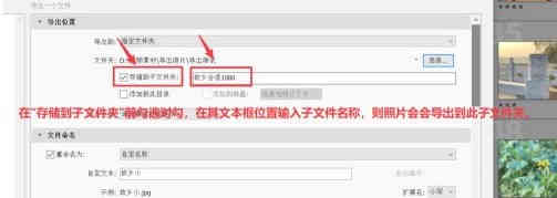 4、在“存储到子文件夹”前勾选对勾,在其文本框位置输入子文件名称,则照片会会导出到此子文件夹。