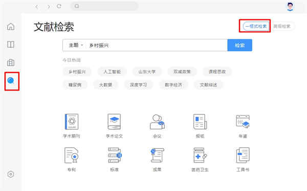 点击界面左侧放大镜,跳转到一框式检索页面,输入检索词,获取文献。