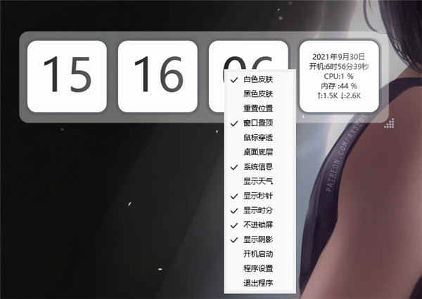 5、你也可以直接右键时钟,一样会出现设置,如更改皮肤、鼠标穿透、显示天气等多种功能,都可以自由使用。