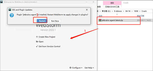 8、接着再将本站提供的“jetbrains-agent-latest.zip”文件拖放到 IDE 窗口,并点击restart;