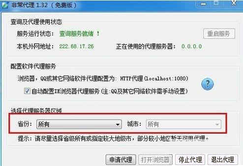 3、点击“申请代理服务器”按钮,获取新的代理服务器地址。成功获得代理服务器地址后会在“查询及代理使用状态”选框中的“正在使用的代理服务器”处显示出当前使用的服务器IP地址。如果需要使用指定省份或城市的IP地址,可以再“选择代理服务区域”选框中进行筛选,如下图: