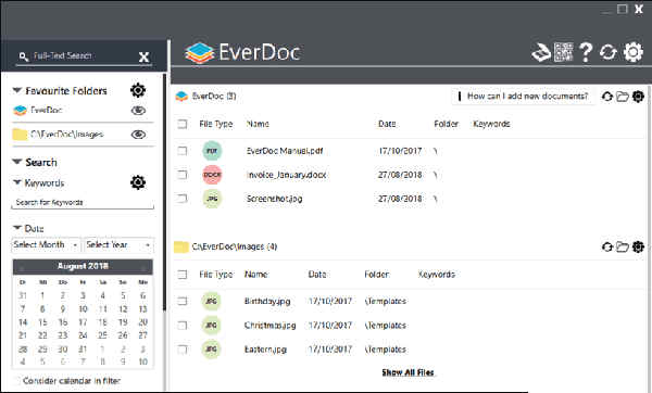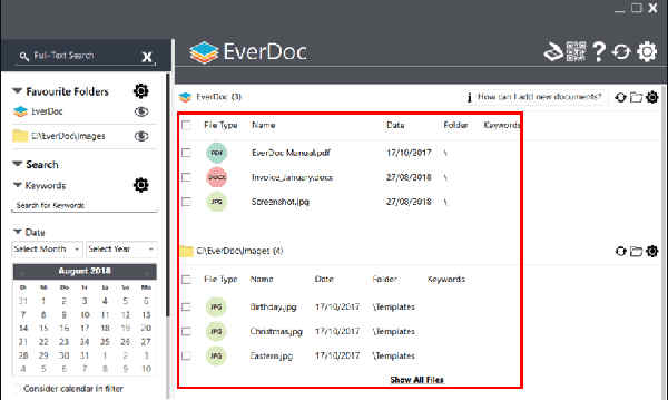 得益于 OCR 文本识别,EverDoc 甚至可以识别图像上的文本。EverDoc 管理的每个文件都可以通过全文搜索轻松找到。只需搜索名称或单词组合,EverDoc 就会准确无误地显示它有权访问的所有匹配文件。