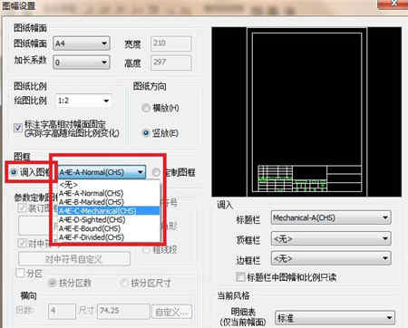 5、左键单击“调入图框”后的选择框,在下拉列表中选择合适的样式,机械工程图形一般选择“XXX-X-Mechanical(CHS)”,如下图所示