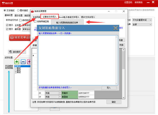 单击抽奖名单设置选择存抽奖名单的记事本导入,将记事本数据复制粘贴到输入框中即可。