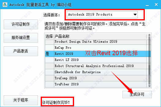 2、运行批量激活工具,勾选需要激活的软件包,点“生成许可”。