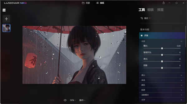 九、最后从功能上来说,在图像调节修饰上,Luminar Neo基本上继承了Luminar AI的AI功能,最大的不同之处:Neo引入了图层模。