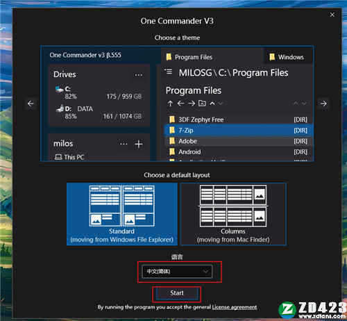 2、进入到【软件的安装界面】,语言可以根据自己的需求来选择,我这儿选择的是中文,然后点击“Start”
