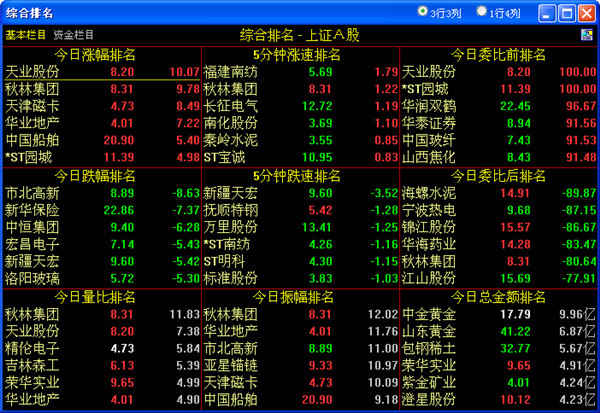 敲数字81、82、83、84、85、86、87,可分别调出上海A、B股,深圳A、B股,沪债、深债,深沪A股的综合排名。系统用9个排成方阵的小窗列出所选市场的股票的涨幅、跌幅、振幅、5分钟涨幅、5分钟跌幅、量比、委比、成交金额排名。